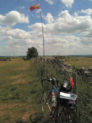 | Arrival at the summit. 5 metre pole attached to bag. |